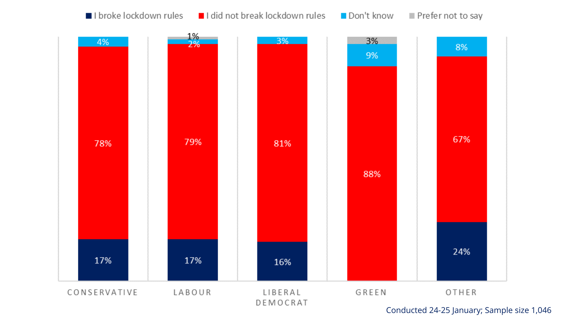 Voters from across the political spectrum were not so different from one another in terms of self-reported adherence to lockdown rules. Supporters of the Conservative, Labour and Liberal Democratic parties were roughly equally likely (17%, 17% and 16% respectively) to have breached lockdown themselves, but less likely than voters for ‘Other’ parties (24%). Labour voters were most likely to know someone who had broken lockdown rules (64%), followed closely by the Conservatives (60%) and ‘Other’ party voters (56%). This suggests that a common recognition of lockdown’s necessity may have cut through political differences, with majorities of voters of all political persuasions broadly following public health regulations. According to the poll, the most Covid-compliant political group was Green voters, only 31% of whom knew someone who had broken lockdown rules and 0% of whom reported having violated lockdown themselves.