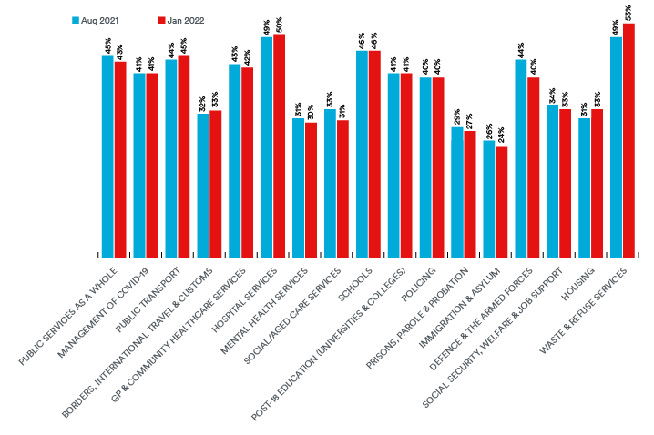 The Omicron wave of late 2021 and early 2022 will likely have had some impact on Britons’ sentiments towards public services. Most obviously, while net satisfaction with Management of Covid-19 remained stable at 41%, net dissatisfaction rose four points to 33%. The latest, and biggest, Covid wave also placed many public services in the UK under considerable strain, and this may have been reflected in our survey data. For instance, 16-24-year-olds were the only age group to indicate an increased level of satisfaction with Social/Aged Care Services relative to our previous report: as they are much less likely than older age groups to need these services, they are by extension much less likely to have been impacted by disruptions in care services due to staffing shortages in the social care sector as a consequence of the Omicron variant[3].