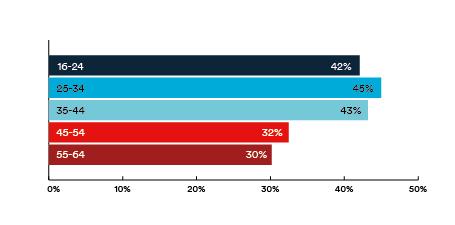 It remained true that older people were less likely to be satisfied, and more likely to be dissatisfied, than younger people. However, whereas in our previous survey, respondents belonging to the middle age bandings (25-34 and 35-44) consistently gave higher satisfaction scores than those in the youngest (16-24) and oldest (55-64) age cohorts, with this round of polling there was evidence that 16-24-year-olds were closing the gap, registering improved satisfaction levels across 14 of the 17 polled areas. The youngest age group’s (mean) average satisfaction score increased from 38% in our first report to 42% in our second.